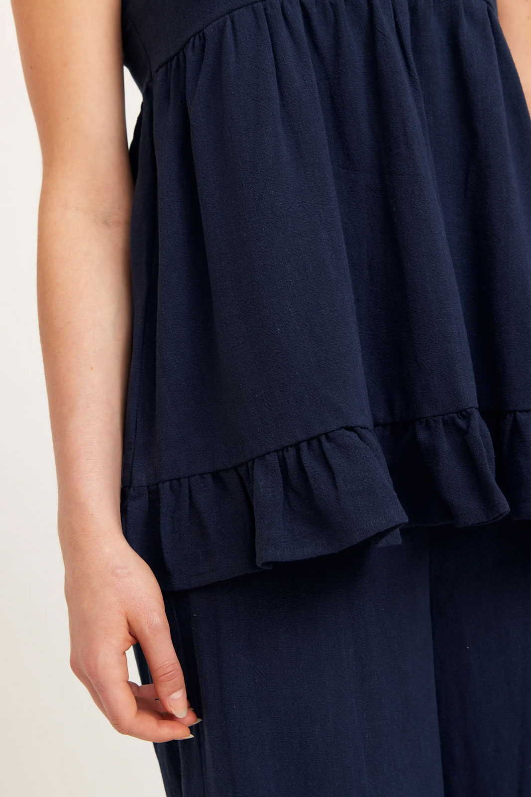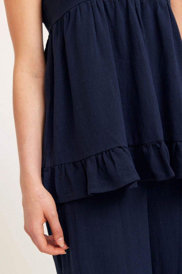 Valmistettu pehmeästä pellava-viskoosiseoksesta, joka sisältää 30 % pellavaa ja 70 % viskoosia, Clara Pellavatoppi tarjoaa luonnollisen hengittävyyskyvyn ja pehmeän rosoisuuden, joka laskeutuu kauniisti vartalon päälle. Tämä materiaalien yhdistelmä tuo miellyttävän tunteen ihoa vasten ja antaa kevyen, rennon ilmeen, joka sopii lämpimään säähän ja pitkiin päiviin ulkona. Yksinkertainen, puhdas muotoilu tekee topista äärimmäisen monikäyttöisen: se on yhtä tyylikäs yhdistettäväksi farkkuihin ja sandaaleihin kuin bleiserin alle tai kesämekon kanssa, eikä se helposti mene pois muodista ajattoman muotonsa ja laadukkaiden materiaalien ansiosta.