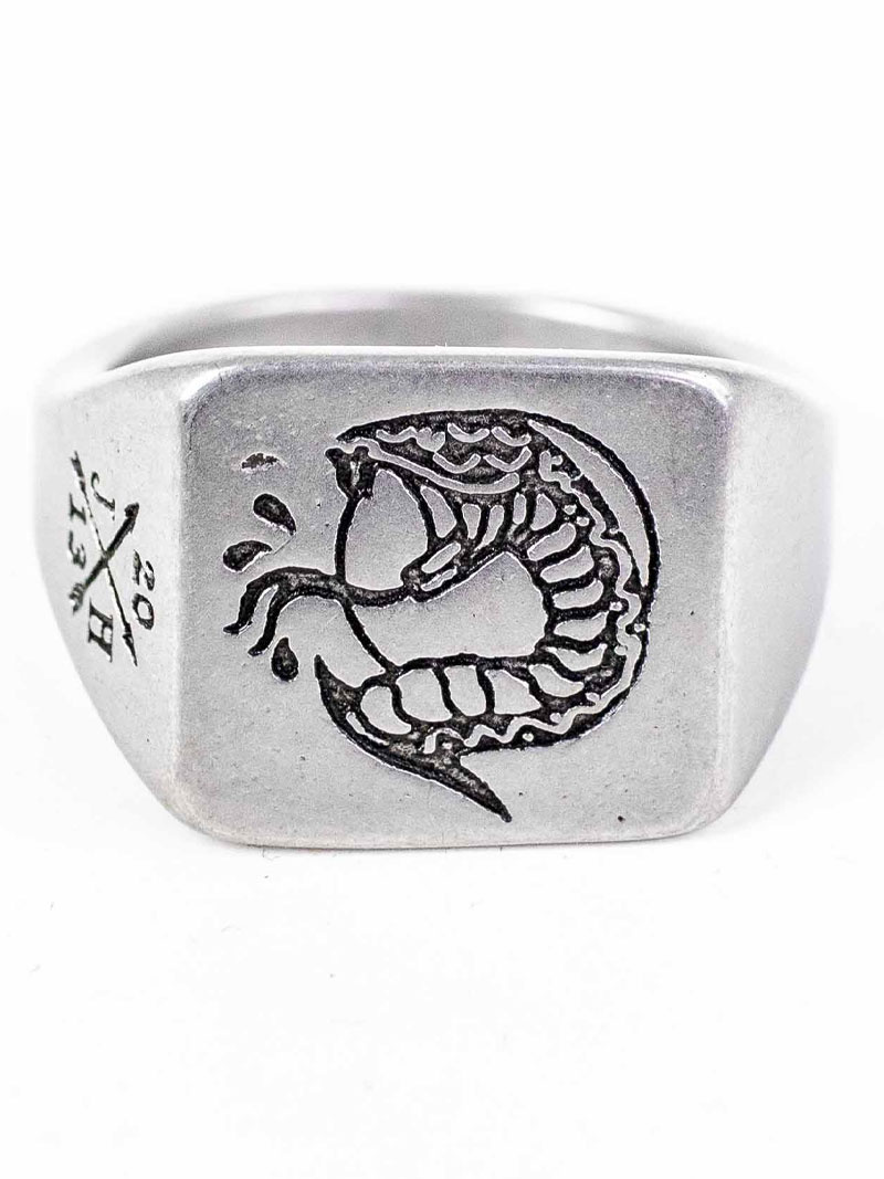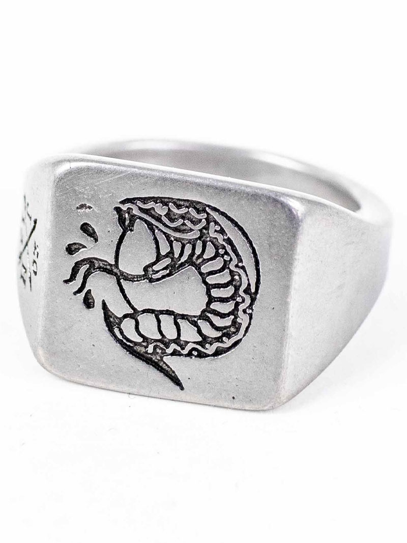 - Ohut nivelsormus, jossa on tatuointiaihe- Renkaan yläosan kaiverrettu motiivi, joka esittää käärmettä