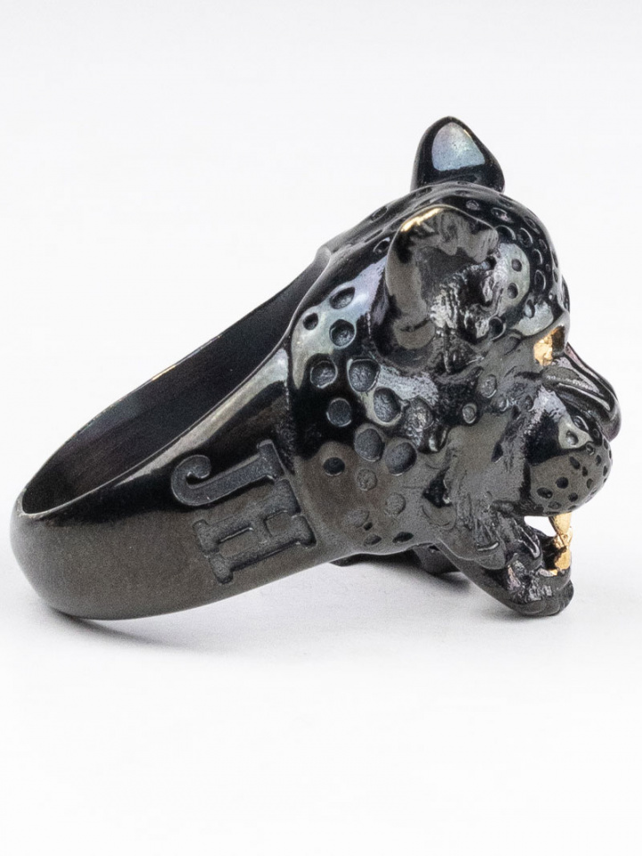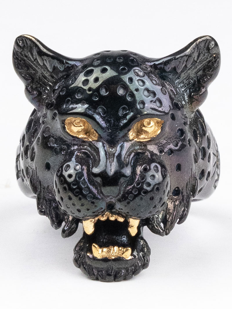 Tämä suunnittelu on uskomattoman yksityiskohtainen pantteri, jolla on kultaiset silmät ja kulmahampaat.