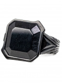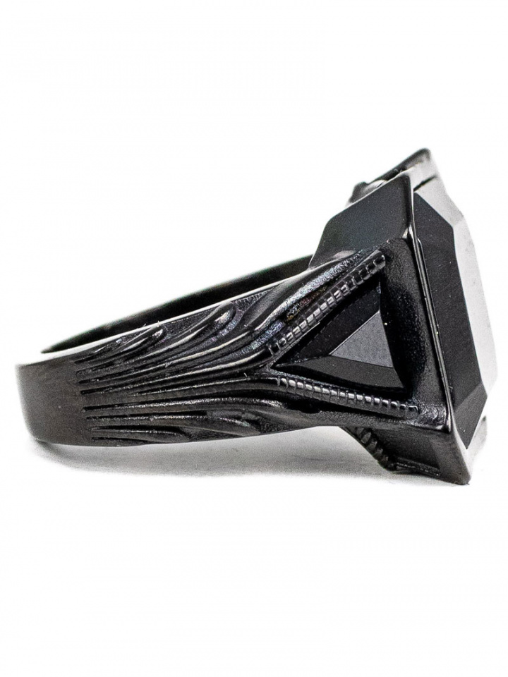 Tämän sormuksen ainutlaatuinen ulkonäkö johtuu mustan pinnoituksen ja mustien kivien yhdistelmästä.