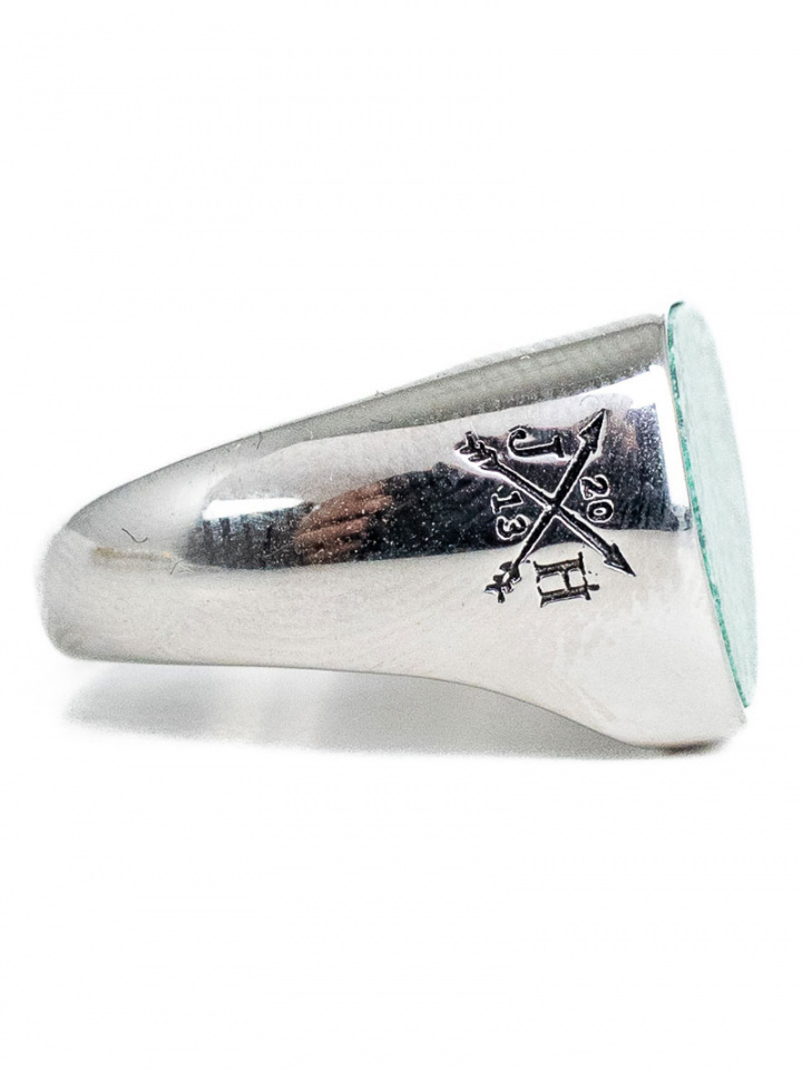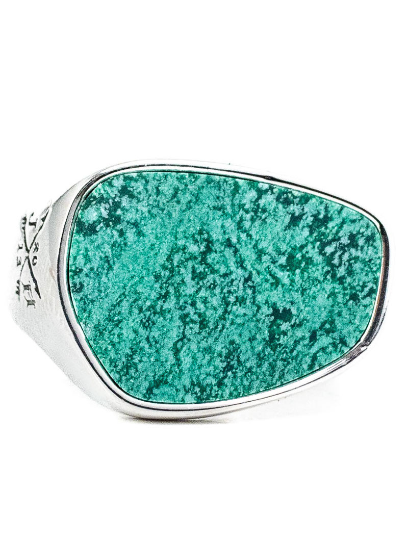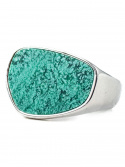 - Epäsäännöllisessä muodossa oleva sormus, jossa on klacki, joka on päällystetty vihreä marmoroidulla Afrikan kivellä (hyraceum).