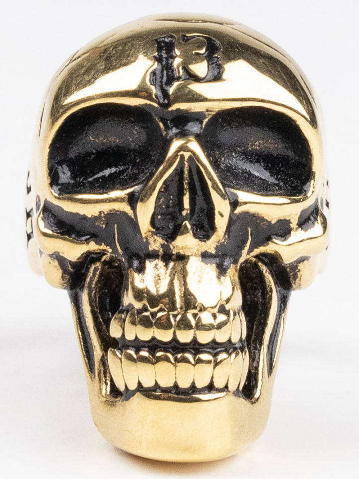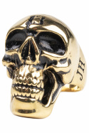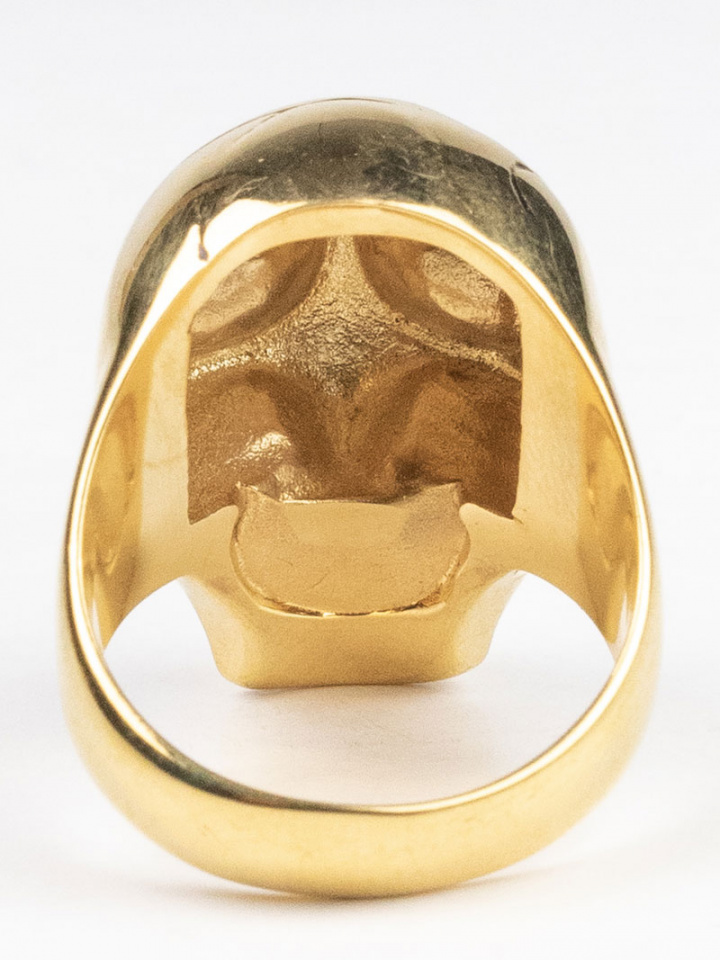 Kullanvärinen sormus, jossa on kullanpäällystetty kallo.