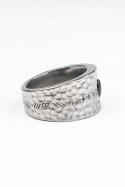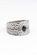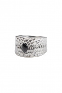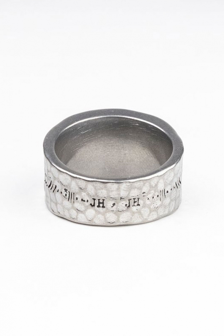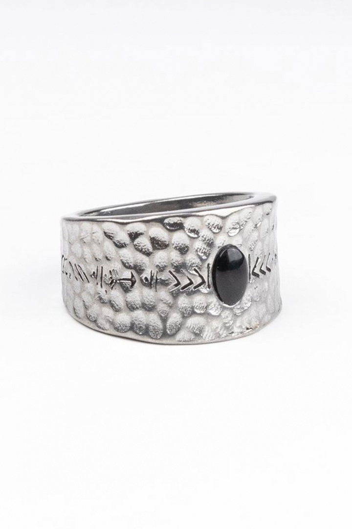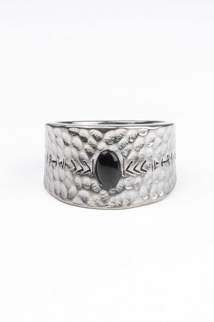 - Sormus, jossa on vasaralla hakattu ilme. Sen ympärillä on pieni kuvio ja sen päällä on pieni lasikivi