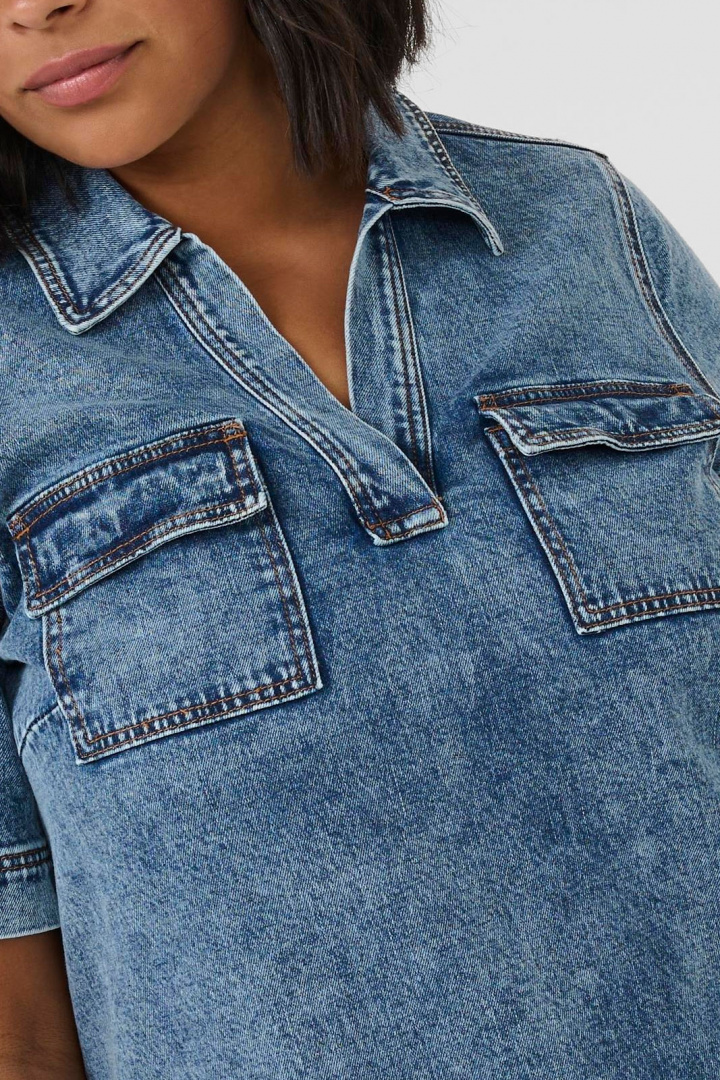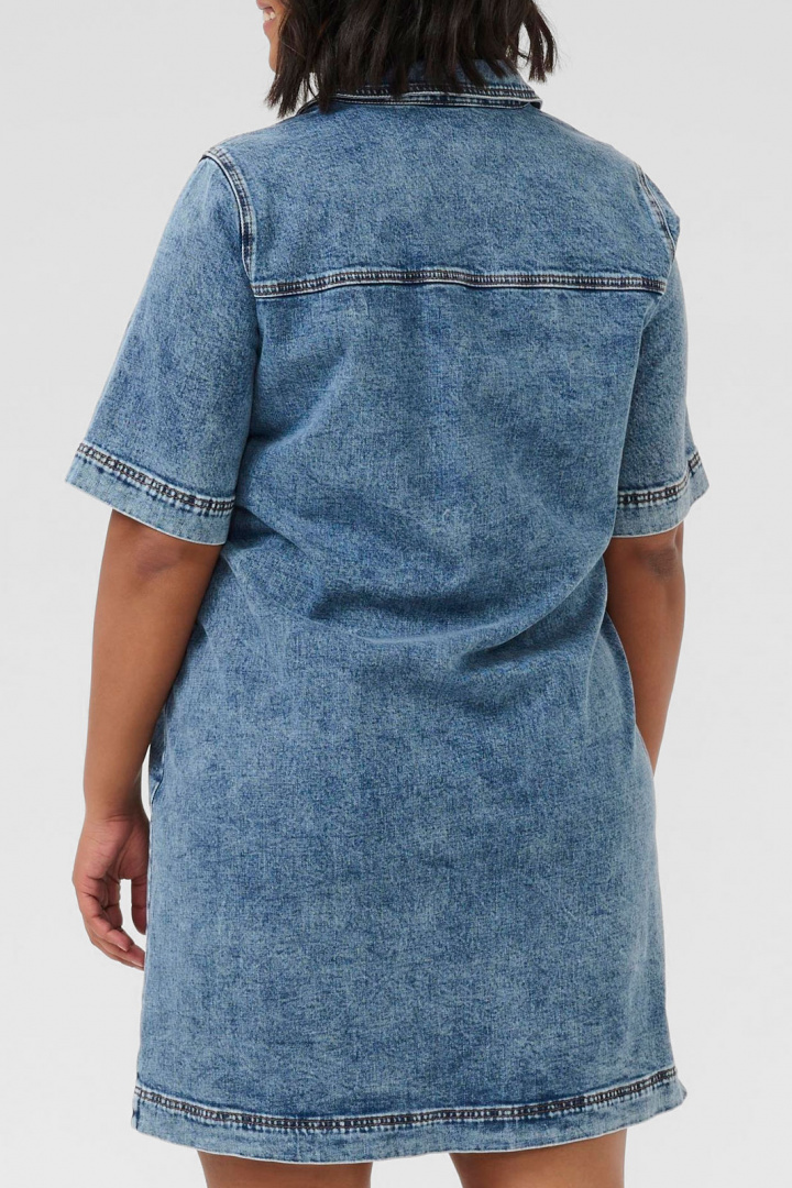 Kcelona Denim Dress Kaffe Curve -merkiltä on plus-kokoinen jeansmekko, jossa on normaali mitoitus ja joka yhdistää klassisen denim-tyylin mukavaan leikkaukseen. V-pääntie kauluksella tuo esiin naisellisuuden, kun taas mekon kaksi läpällistä rintataskua vahvistavat takkimaisuutta ja tarjoavat käytännön yksityiskohtia arkeen ja vapaa-aikaan.