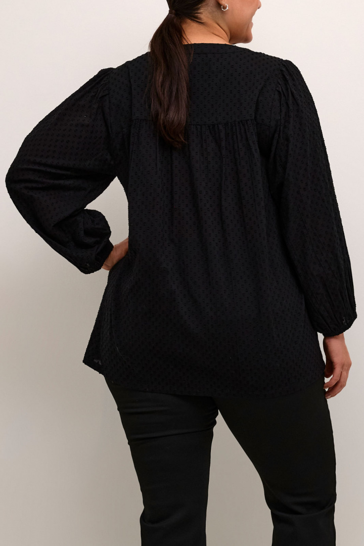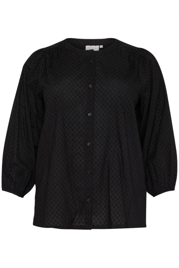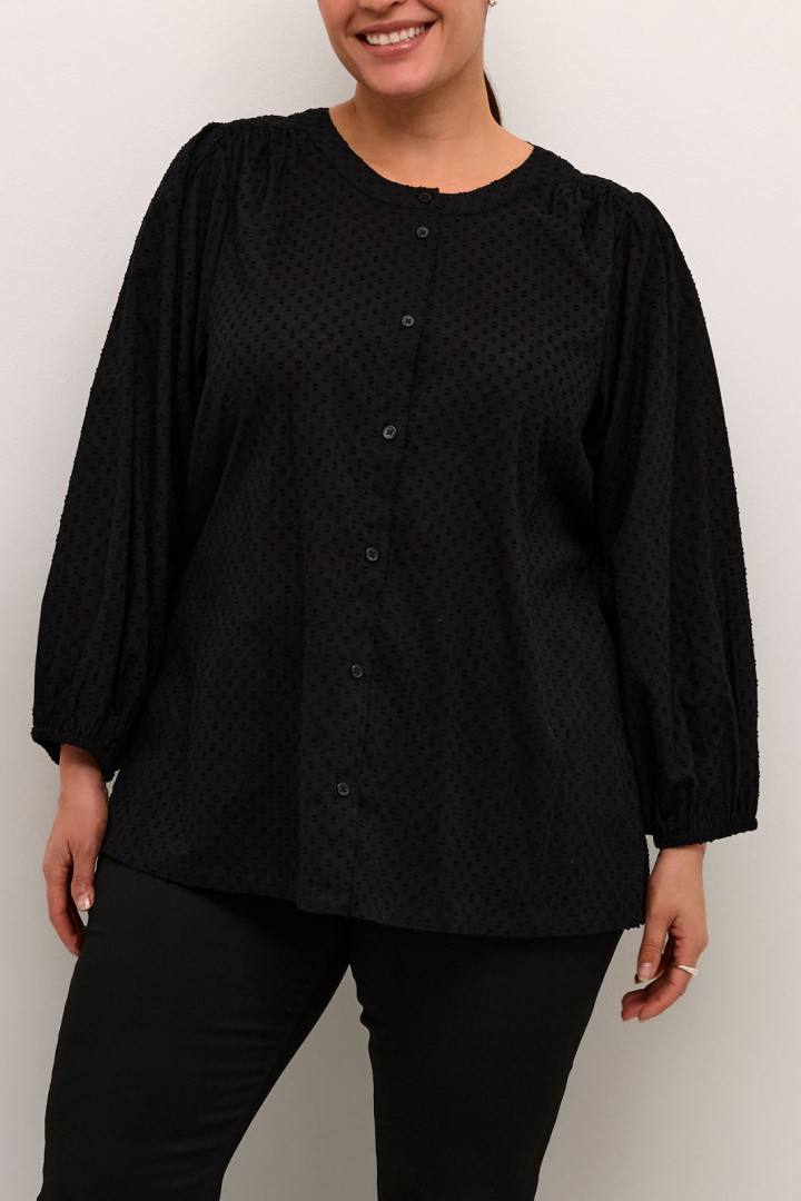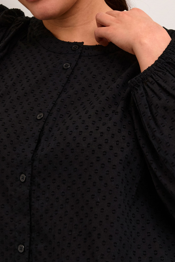 Kcrory Shirt Kaffe Curve -merkiltä on naisten paita normaali istuvuudella, joka sopii täydellisesti plus-size-vaatekaappiin. 100% puuvillasta valmistettu paita tuntuu pehmeältä ihoa vasten ja tarjoaa hyvää hengittävyyttä koko päivän. Pyöreä pääntie antaa klassisen ja mukavan vaikutelman, kun taas nappilukitus edessä helpottaa tyylin mukauttamista tilaisuuden mukaan. Resori hihansuissa luo naisellisen siluetin ja pysyy hihat paikoillaan kaikissa aktiviteeteissa. Kuvioitu pinta tekee vaatteesta hauskemman käyttää ilman liiallista ylilyöntiä, joten Kcrory Shirt sopii yhtä hyvin arkeen kuin hieman juhlallisempiinkin asusteisiin. Osana Kaffe Curve -valikoimaa se on suunniteltu keskittymään mukavuuteen ja istuvuuteen plus-size-käyttäjille, mikä tekee siitä varman ja