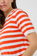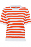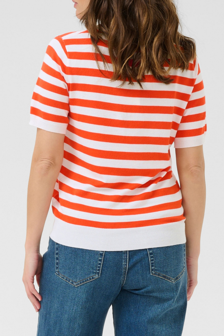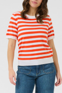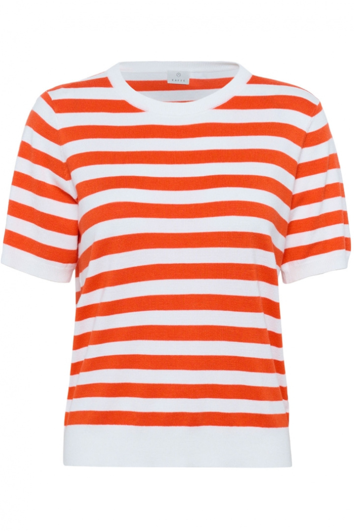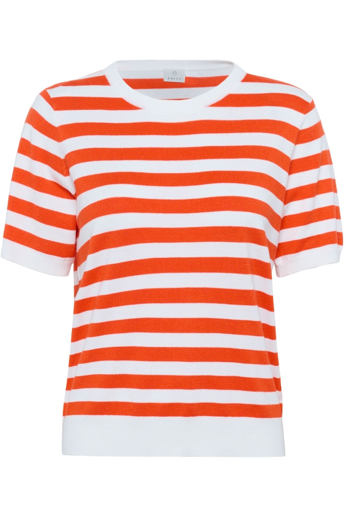 KAFFE Kalava - lyhythihainen neulepaita normaalissa mitoituksessa, joka sopii yhtä hyvin arkikäyttöön kuin hieman juhlallisemmille asuille. Pyöreässä pääntiessä on resori ja sama resoriviimeistely toistuu kauluksessa, hihansuissa ja alareunassa, mikä antaa miellyttävän, tukevan tunteen ja kauniin, yhtenäisen viimeistelyn. Raidallinen, fintikkaava pinta tuo kevyttä rakennetta ja eksklusiivista tuntua ilman, että se tuntuu ylikorostetulta. Valmistettu pehmeästä viskoosi-nylon-seoksesta, jossa on 80 % viskoosia ja 20 % nylonia, joka antaa kauniin laskeutumisen, hyvän kestävyden ja mukavuuden ihoa vasten. Tämä naisten paita on helppo tyylitellä - yhdistä se farkkuihin