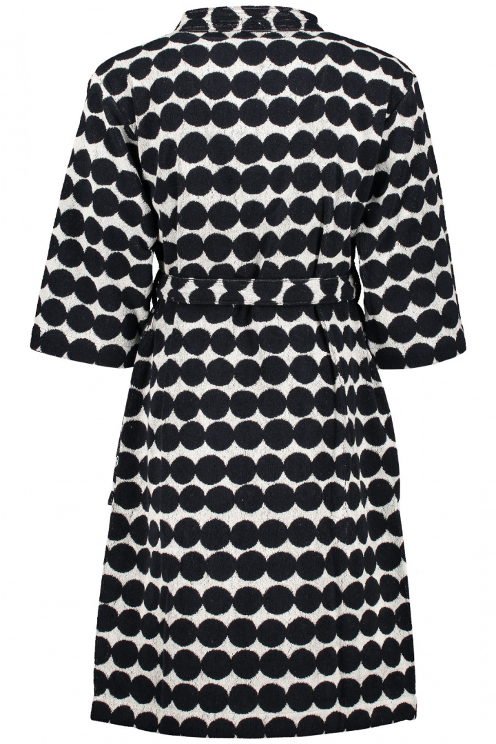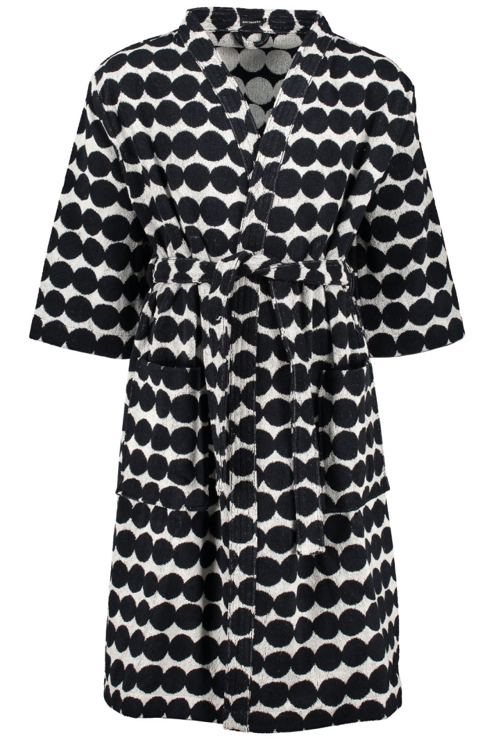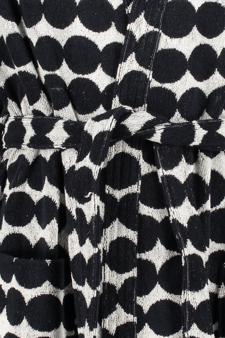 - Tämä paksu ja mukava puuvillafroteinen kylpytakki on koristeltu mustavalkoisella Räsymatto-kuviolla. Kylpytakissa on etupuolella suuret taskut ja irrotettava vyö. Kylpytakin sisäpuoli on värinegatiivinen ulospäin päin, mikä antaa takkille leikkisän ulkonäön.