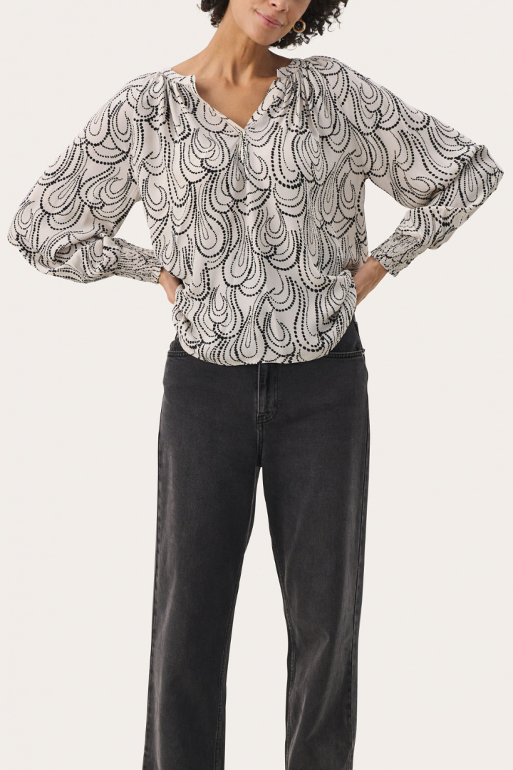 Tenniepw Pusero Part Two:lta on naisten pusero normaali istuvuudella, joka yhdistää ajattoman eleganssin mukavaan arkipukeutumiseen. V-aukkoinen kaula-aukko tuo naiseutta, kun taas hihansuissa oleva resori luo rennon mutta harkitun siluetin, joka istuu mukavasti liikkeessäsi. Kuviollinen muotoilu tekee puserosta helposti yhdisteltävän statement-vaatekappaleen, jota voi helposti stailata ylös tai alas tilanteen mukaan.