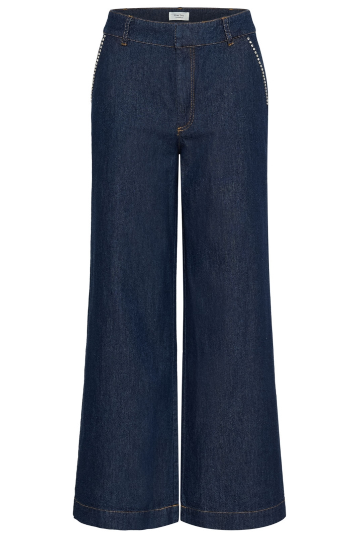Ursulapw Je Jeansit Part Twolta ovat naisten farkut, joissa on normaali vyötärö ja suorat lahkeet, ja ne sopivat yhtä hyvin arkeen kuin hieman juhlallisempiin tilaisuuksiin. Normaali vyötärö tarjoaa mukavan istuvuuden lantion alueella, kun taas suorat lahkeet luovat ajattoman siluetin, joka on helppo yhdistää kaikkeen lenkkareista korkokenkiin. Avoimen sivutaskusuunnittelu antaa rentoa, modernia tunnelmaa, kun taas väärennetyt taskut takana luovat puhtaan ja tyylikkään takaprofiilin. Hakaskiinnitys ja vetoketju tarjoavat klassisen sulkemisen, joka tuntuu turvalliselta ja käytännölliseltä arjessa, ja huomaamattomat strassiyksityiskohdat tuovat hienovaraista glamouria, joka nostaa as