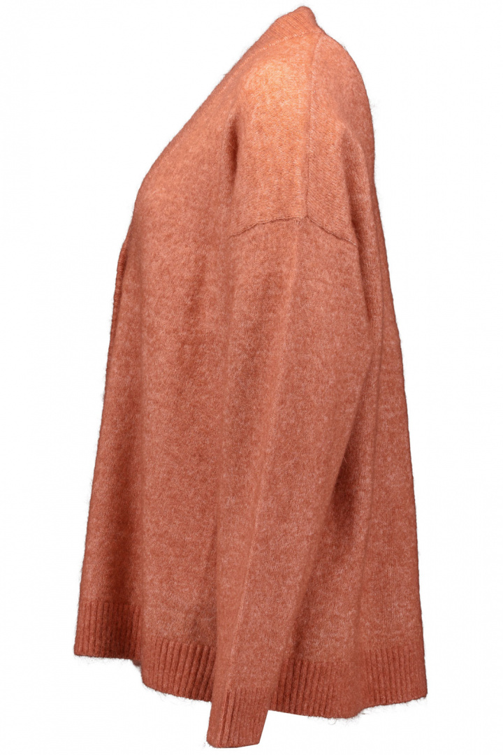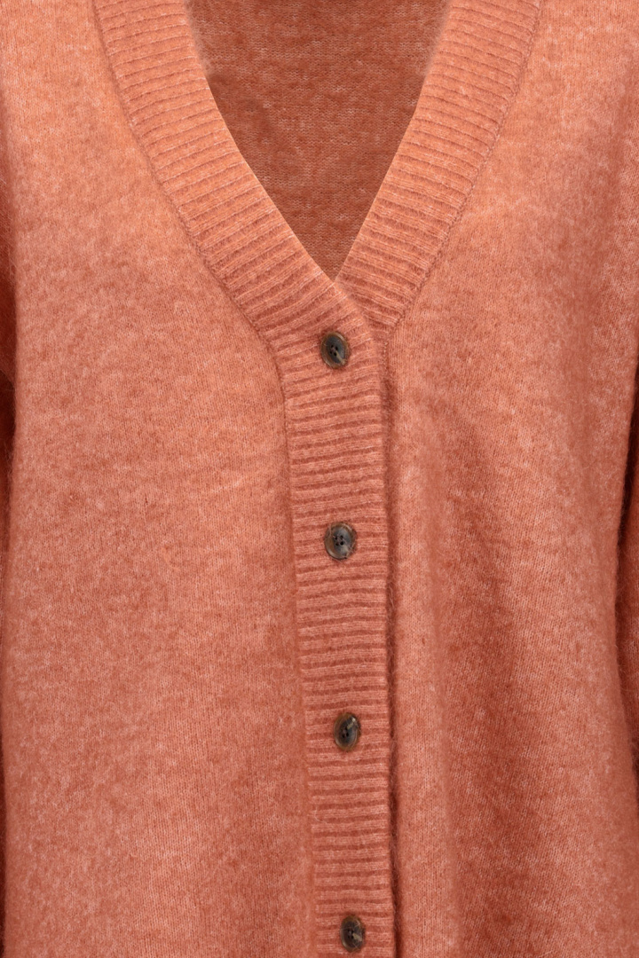 V-pääntie tuo esiin imartelevaa, naisellista siluettia, samalla kun klassinen napitus edessä antaa mahdollisuuden säädellä tyyliä tilaisuuden mukaan. Ribatut resorit kauluksessa, hihoissa ja helmassa luovat selkeää rakennetta ja auttavat vaatetta säilyttämään muotonsa, samalla kun ne lisäävät lämpöä juuri siellä, missä sitä eniten tarvitaan. Tämä neulottu neuletakki tuntuu sekä pehmeältä että luksusmaiselta ihoa vasten, kiitos erityisen materiaaliseoksen.